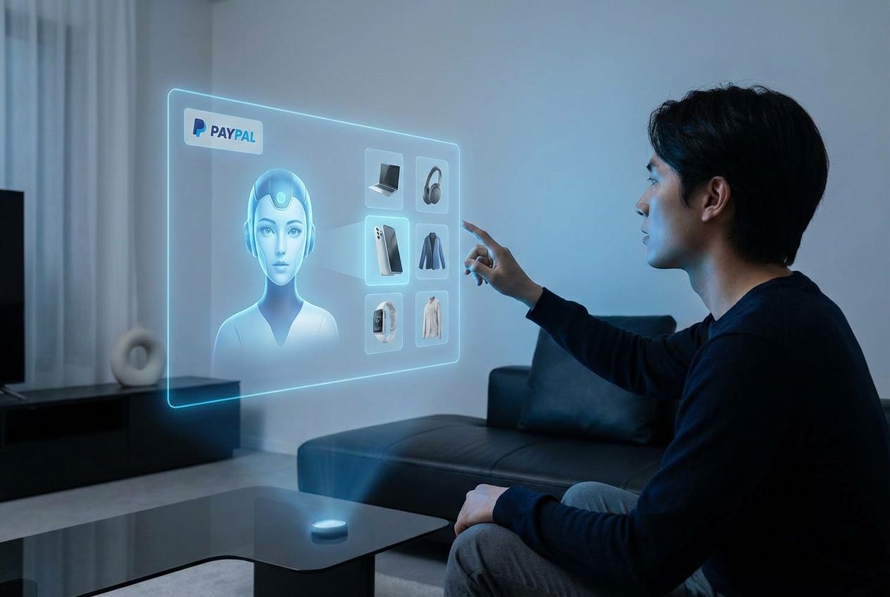 A borító képet a Google Gemini 3 Pro képgenerátor készítette az alábbi prompt alapján: A person shopping on a futuristic holographic AI chatbot interface, floating product images, PayPal logo visible, modern minimalist room, soft blue lighting, photorealistic style