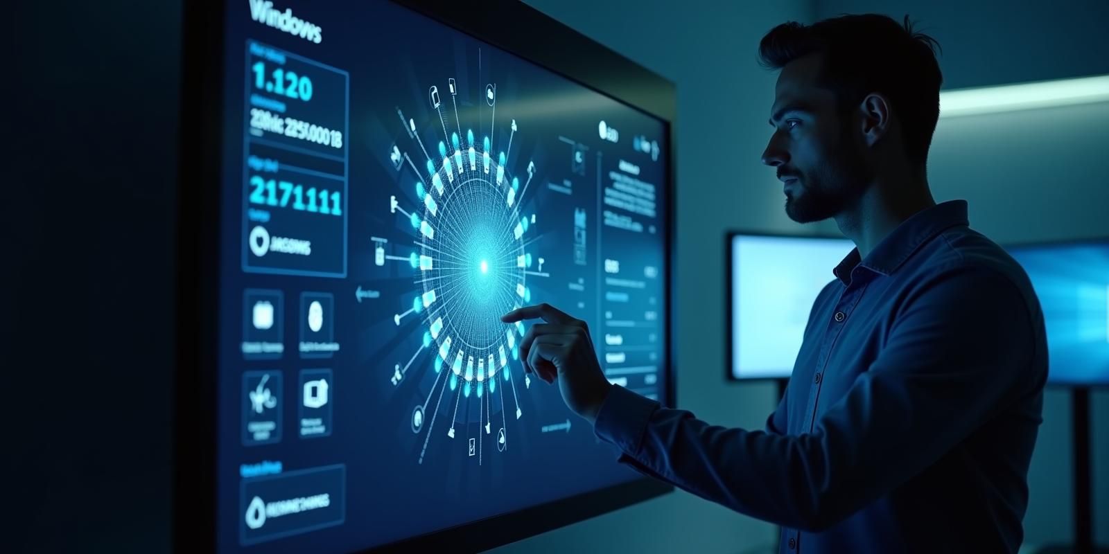 A borító képet FLUX.1-dev képgenerátor készítette az alábbi prompt alapján: Futuristic Windows 11 interface with AI features, showing a person interacting with a sleek Copilot+ PC, dynamic visualization of AI processing, professional quality product photograph.