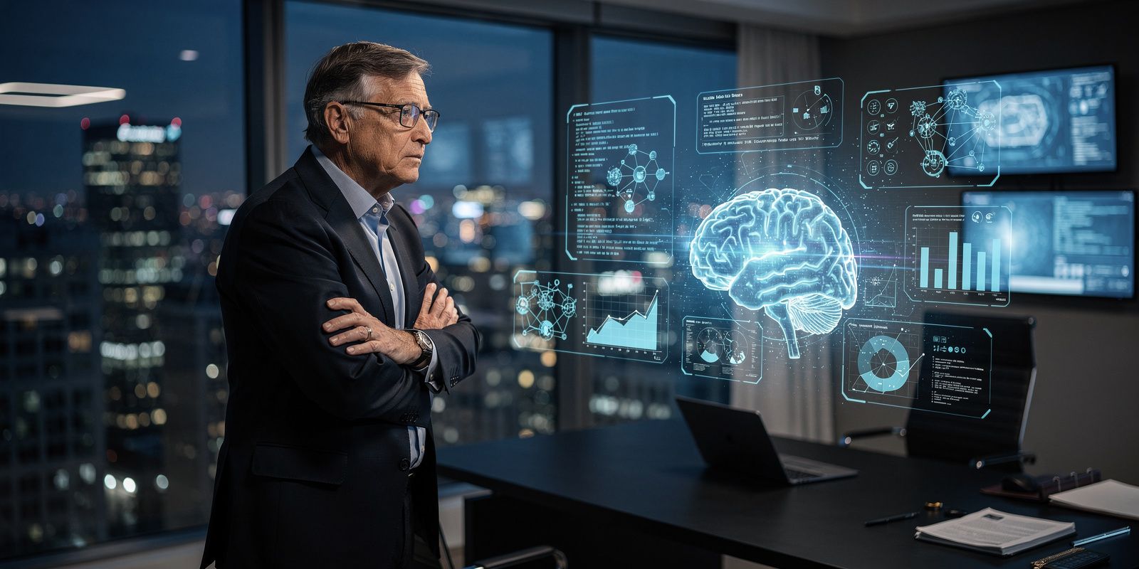 A borító képet FLUX.1-dev képgenerátor készítette az alábbi prompt alapján: Bill Gates in a modern office, looking concerned at holographic AI data visualizations, dramatic lighting, photorealistic style, tech atmosphere